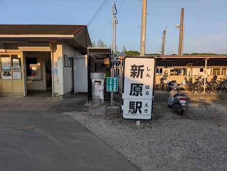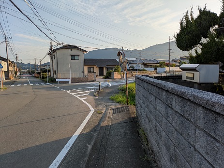 つきあたりの道を「左に」曲がります。 この写真の右側にある西鉄バス停が新原(福岡空港→宇美のルート)