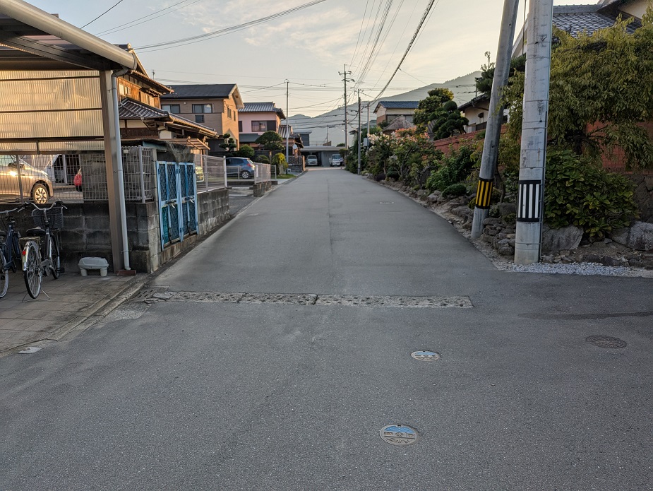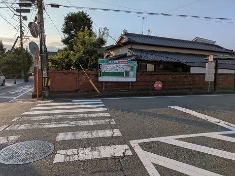 つきあたりを「右に」曲がります。この道路は狭いので自動車に注意して下さい。